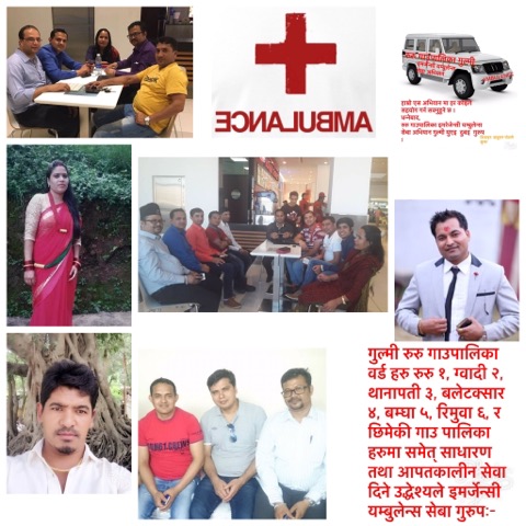 काठमाडौं १४ भदौ । गुल्मी जिल्लाको रुरु गाउपालिका तथा छिमेकी गाउपालिकामा आकस्मिक सुविधा दिने उद्देश्यले एम्वुलेन्स सञ्चालन गरिने भएको छ । कामको शिलशिलामा दुवइ पुगेका नेपालीहरुको सहयोगमा एम्बुलेन्स सञ्चालन गर्न लागिएको दुवइबाट बाबुराम सुनारले बताएका छन । सुनारका अनुसार एम्बुलेन्स खरिद गर्नका लागि दुवइमा समिति गठन भएको छ । उक्त समिति मार्फत आर्थिक संकलन भइरहेको छ । अहिलेसम्म छ लाख ५० हजार रुपैया सहयोग गर्ने विभिन्न व्यक्तिबाट प्रतिबद्धता आएको छ । कतिले आर्थिक सहयोग गरिसकेको सुनारले जानकारी गराएका छन् ।
